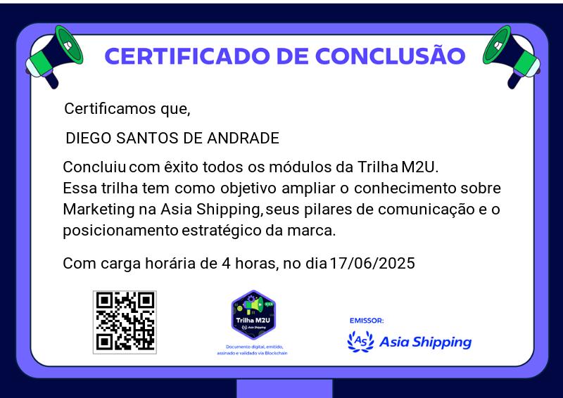 Esta badge é concedida aos colaboradores que completaram com sucesso a Trilha M2U, que teve como objetivo proporcionar uma visão estratégica sobre os pilares da comunicação e do posicionamento da marca, além de fortalecer o entendimento do marketing como ferramenta essencial no contexto organizacional.