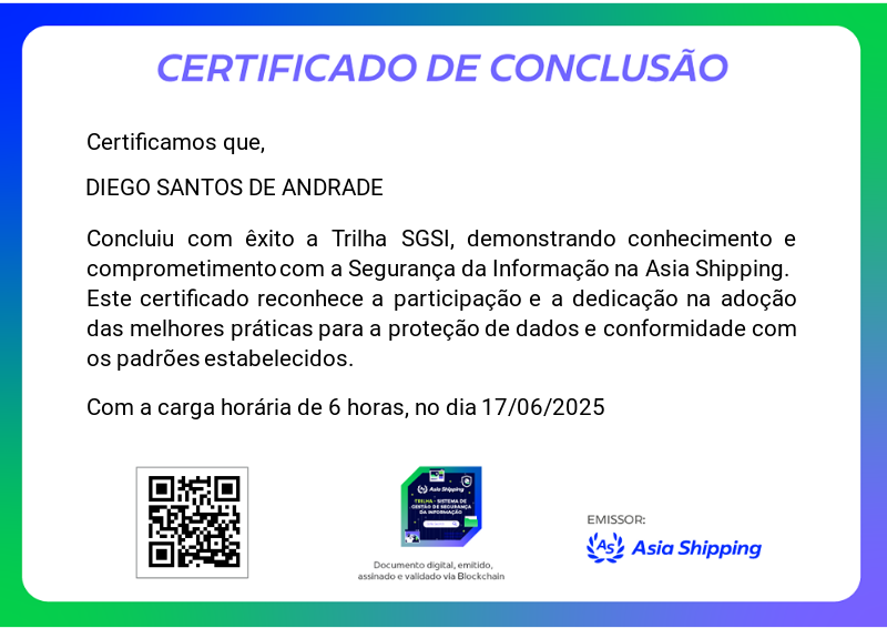 Esta badge é concedida aos colaboradores que completaram com sucesso a trilha de cursos sobre Segurança da Informação, demonstrando conhecimento e compromisso com as melhores práticas de proteção de dados e a conformidade com a política de segurança da Asia Shipping.