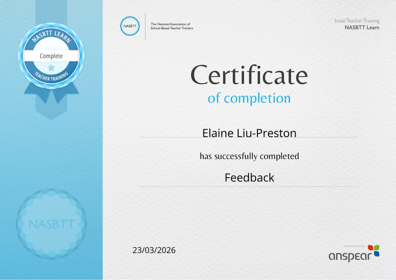 Completed the NASBTT Learn module Feedback. 1 hour of self-directed learning.