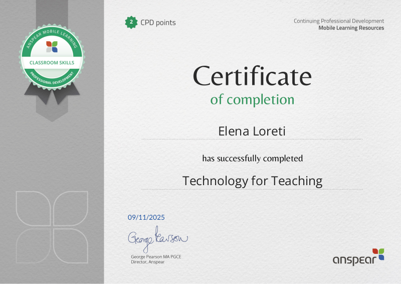 Awarded for completing the Technology for Teaching CPD course from Anspear.