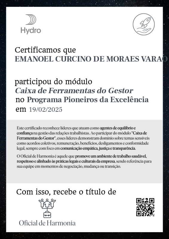 Esta badge reconhece líderes que atuam como agentes de equilíbrio e confiança na gestão das relações trabalhistas. Ao participar do módulo "Caixa de Ferramentas do Gestor", esses líderes demonstram domínio sobre temas sensíveis como acordos coletivos, remuneração, benefícios, desligamentos e conformidade legal, sempre com foco em comunicação empática, justiça e transparência.