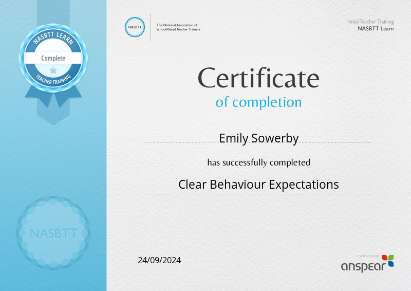 Completed the NASBTT Learn module Clear Behaviour Expectations. 1 hour of self-directed learning.