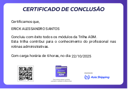 Esta badge é concedida aos colaboradores que completaram com sucesso a Trilha ADM, que teve como objetivo preparar o colaborador para atuar com excelência em rotinas administrativas essenciais.