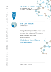 Completed the Oral Care module on the Society of Cosmetic Scientists (SCS) Introduction to Cosmetic Science (ICS) course and passed the module test.