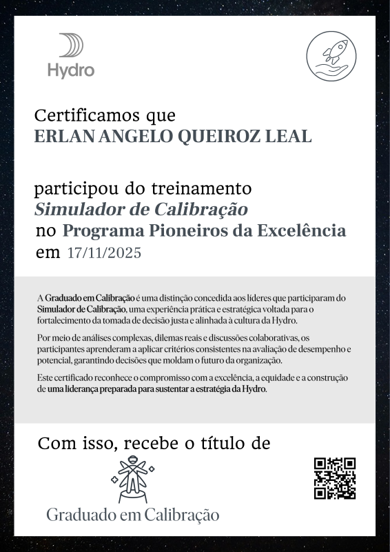 A Graduado em Calibração é uma distinção concedida aos líderes que participaram do Simulador de Calibração, uma experiência prática e estratégica voltada para o fortalecimento da tomada de decisão justa e alinhada à cultura da Hydro.