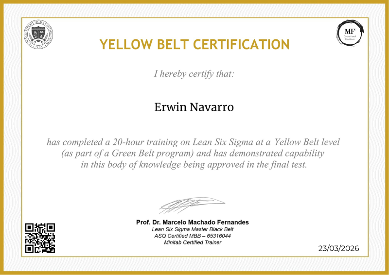 Delving into the intermediate principles of Lean Six Sigma, the Yellow Belt certification provided by MF OPEX, guided by Professor Marcelo Fernandes, marks a significant progression in operational excellence training. Through a meticulously structured curriculum blending advanced theories with practical application, participants deepen their understanding of process optimization, advanced data analysis, and project leadership. Professor Fernandes' renowned expertise enriches the program with cutting-edge methodologies, empowering learners to spearhead impactful improvements within their organizations. Serving as a pivotal milestone in professional development, this certification not only opens doors to larger-scale projects but also fosters the confidence and skills needed to drive transformative change across diverse industry landscapes.