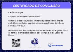 A Trilha Compliance é mais uma Badge do programa de certificação da Asia Shipping. Com ela você terá a oportunidade de conhecer mas sobre Compliance na Asia Shipping, como também Gestão de Riscos, suas principais definições e etapas de identificação.