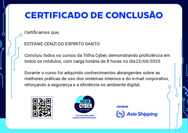 A Trilha Cyber é um dos badges do programa de certificação da Asia Shipping. Ela aborda as melhores práticas de uso dos sistemas internos e do e-mail corporativo, reforçando a segurança e a eficiência no ambiente digital.