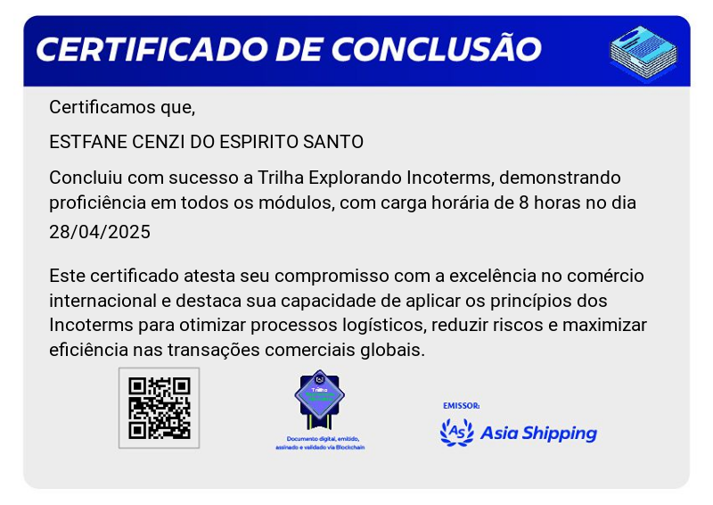 A Trilha Explorando Incoterms inclui elementos relacionados ao comércio internacional, como ícones representando diferentes termos de Incoterms, símbolos de negócios globais ou elementos que destacam a importância do entendimento dos Incoterms para profissionais envolvidos em transações comerciais internacionais. Essa badge serve como um símbolo de conquista e conhecimento na área de comércio internacional e logística.