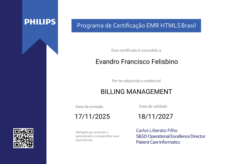 A credencial de PROFESSIONAL BILLING MANAGEMENT é composta por Cadastros de Faturamento, que abrange convênios, preços e regras, conta do paciente, parâmetros de faturamento e gestão de Órteses, Próteses e Materiais Especiais (OPME); e sobre Troca de Informações em Saúde Suplementar (TISS).