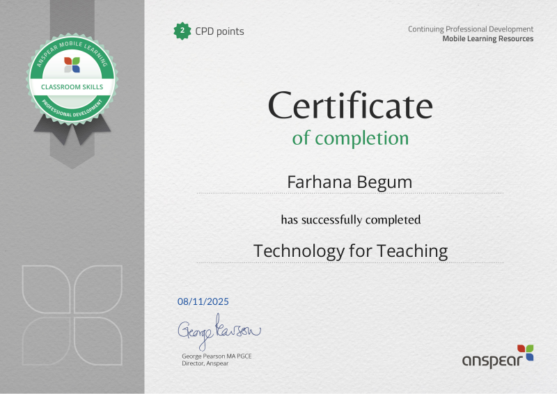 Awarded for completing the Technology for Teaching CPD course from Anspear.
