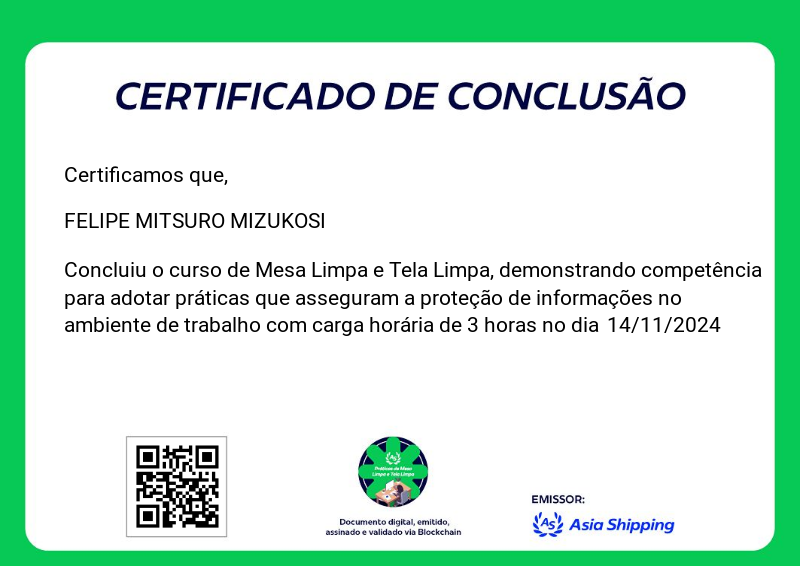O badge de treinamento de Mesa Limpa e Tela Limpa da Asia Shipping capacita os colaboradores a manterem o ambiente de trabalho organizado e seguro, reduzindo o risco de exposição de informações confidenciais e fortalecendo a cultura de segurança da Informação na empresa.
