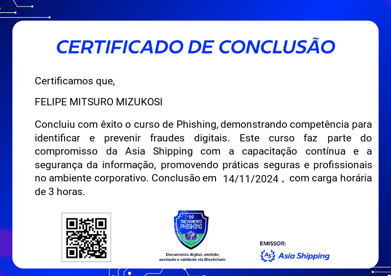 O badge de treinamento em Phishing faz parte do programa de certificação da Asia Shipping e capacita os participantes a reconhecer e evitar tentativas de fraude digital. Com foco em práticas seguras de comunicação e proteção de dados no ambiente corporativo, o treinamento prepara os colaboradores para identificar ameaças e fortalecer a segurança da informação na empresa.
