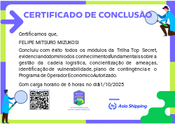 Esta badge certifica a conclusão da Trilha Top Secret. O participante demonstrou domínio sobre conceitos de Gestão da Cadeia Logística, conscientização de ameaças, identificação de vulnerabilidades, plano de Contingência e Programa de Operador Econômico Autorizado.