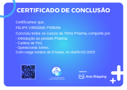 A Trilha Pharma é mais um Badge do programa de certificação da Asia Shipping. Através dessa trilha você será apresentado(a) a requisitos fundamentais do mundo Pharma, tais como: maiores informações das nossas certificações, nossos cases de sucesso e cadeia do frio.
