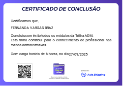 Esta badge é concedida aos colaboradores que completaram com sucesso a Trilha ADM, que teve como objetivo preparar o colaborador para atuar com excelência em rotinas administrativas essenciais.
