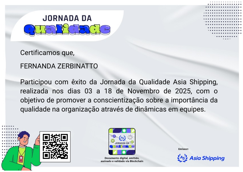 Este badge foi concedido aos colaboradores que participaram da Jornada da Qualidade 2025, evento promovido pelo Departamento de Qualidade da Asia Shipping.