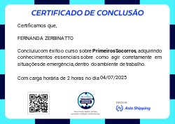 Esta badge digital certifica a conclusão do Treinamento de Primeiros Socorros da Asia Shipping, demonstrando um compromisso proativo com a segurança e a saúde de todos no ambiente de trabalho.