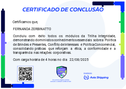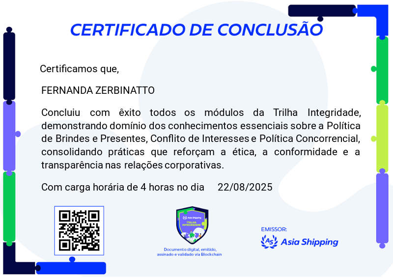 Esta badge certifica a conclusão da trilha de Integridade. O participante demonstrou domínio dos conhecimentos essenciais sobre a Política de Brindes e Presentes, Conflito de Interesses e Política Concorrencial, consolidando práticas que reforçam a ética, a conformidade e a transparência nas relações corporativas. Esses pilares são fundamentais para a integridade, a reputação e o sucesso da organização.