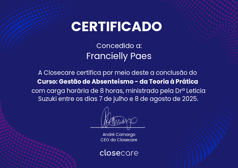 O curso de Gestão de Absenteísmo: da Teoria à Prática aconteceu entre os dias 7 de julho e 8 de agosto. As aulas foram ministradas pela Drª Leticia Suzuki (https://www.linkedin.com/in/leticia-cristina-suzuki-621585131/). O curso foi composto por seis aulas que abordaram os seguintes tópicos: