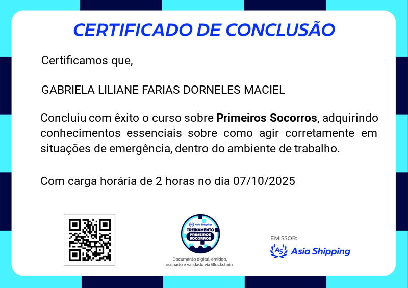 Esta badge digital certifica a conclusão do Treinamento de Primeiros Socorros da Asia Shipping, demonstrando um compromisso proativo com a segurança e a saúde de todos no ambiente de trabalho.