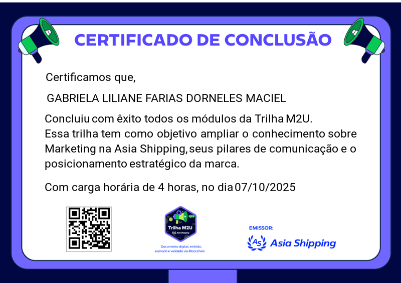 Esta badge é concedida aos colaboradores que completaram com sucesso a Trilha M2U, que teve como objetivo proporcionar uma visão estratégica sobre os pilares da comunicação e do posicionamento da marca, além de fortalecer o entendimento do marketing como ferramenta essencial no contexto organizacional.