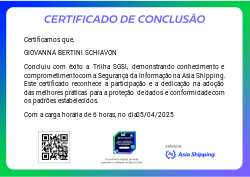 Esta badge é concedida aos colaboradores que completaram com sucesso a trilha de cursos sobre Segurança da Informação, demonstrando conhecimento e compromisso com as melhores práticas de proteção de dados e a conformidade com a política de segurança da Asia Shipping.