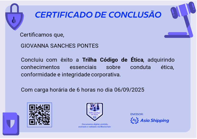 Este badge certifica a conclusão da Trilha Código de Ética. Atesta conhecimento em conduta íntegra, conformidade legal (LGPD, SGSI), anticorrupção e processos de investigação interna, essenciais para a organização.