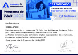 Este treinamento convida os participantes a explorar como as narrativas pessoais moldam identidade, comportamento e escolhas ao longo da vida. A partir de reflexões guiadas e exercícios práticos, cada pessoa aprende a identificar padrões nas histórias que conta sobre si, ressignificar perspectivas limitantes e construir uma narrativa mais consciente, fortalecedora e coerente com seus objetivos.