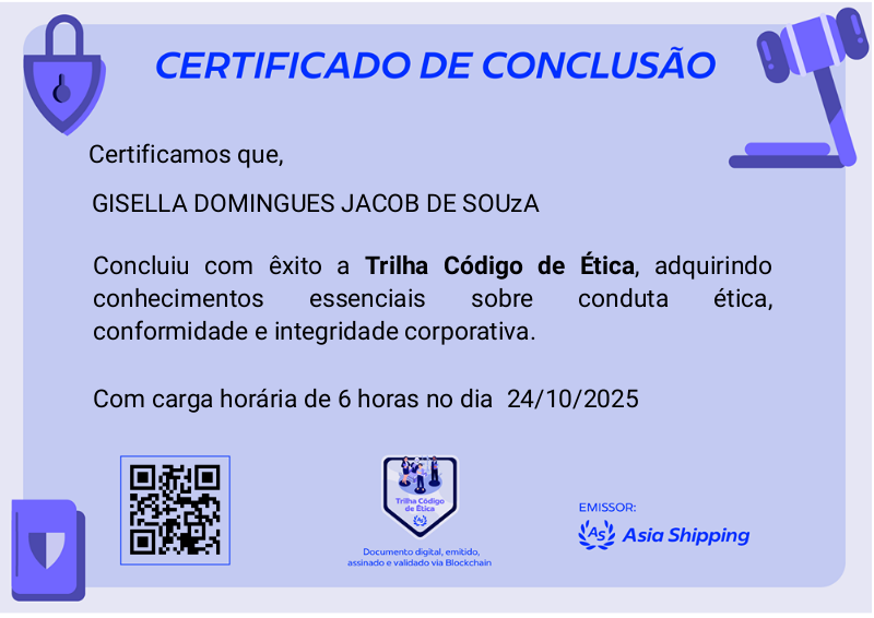 Este badge certifica a conclusão da Trilha Código de Ética. Atesta conhecimento em conduta íntegra, conformidade legal (LGPD, SGSI), anticorrupção e processos de investigação interna, essenciais para a organização.