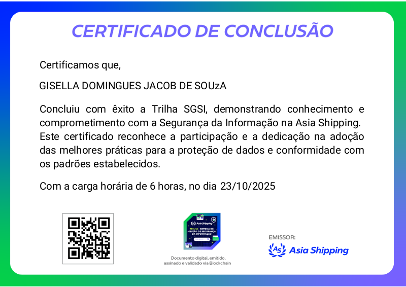 Esta badge é concedida aos colaboradores que completaram com sucesso a trilha de cursos sobre Segurança da Informação, demonstrando conhecimento e compromisso com as melhores práticas de proteção de dados e a conformidade com a política de segurança da Asia Shipping.