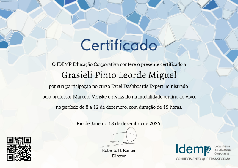 Através da experiência de anos de consultoria do Professor o treinamento apresenta os melhores recursos disponíveis do Excel para gerar dashboards de forma rápida, segura e impactante.