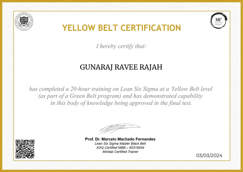 Delving into the intermediate principles of Lean Six Sigma, the Yellow Belt certification provided by MF OPEX, guided by Professor Marcelo Fernandes, marks a significant progression in operational excellence training. Through a meticulously structured curriculum blending advanced theories with practical application, participants deepen their understanding of process optimization, advanced data analysis, and project leadership. Professor Fernandes' renowned expertise enriches the program with cutting-edge methodologies, empowering learners to spearhead impactful improvements within their organizations. Serving as a pivotal milestone in professional development, this certification not only opens doors to larger-scale projects but also fosters the confidence and skills needed to drive transformative change across diverse industry landscapes.