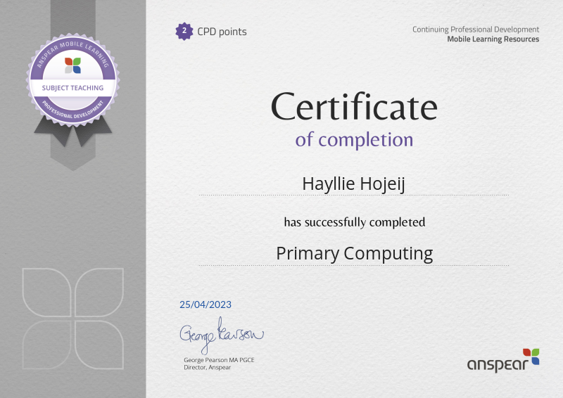 Awarded for completing the Primary Computing CPD course from Anspear.
