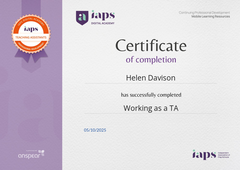 Awarded for completing the Working as a TA CPD course from the IAPS Digital Academy.