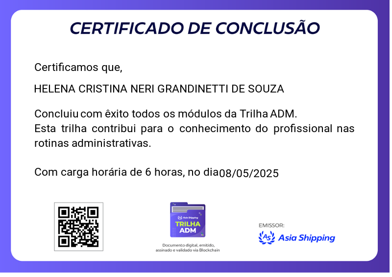 Esta badge é concedida aos colaboradores que completaram com sucesso a Trilha ADM, que teve como objetivo preparar o colaborador para atuar com excelência em rotinas administrativas essenciais.