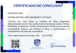 Esta badge certifica a conclusão da trilha de Integridade. O participante demonstrou domínio dos conhecimentos essenciais sobre a Política de Brindes e Presentes, Conflito de Interesses e Política Concorrencial, consolidando práticas que reforçam a ética, a conformidade e a transparência nas relações corporativas. Esses pilares são fundamentais para a integridade, a reputação e o sucesso da organização.