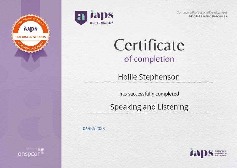Awarded for completing the Speaking and Listening: TAs CPD course from the IAPS Digital Academy.
