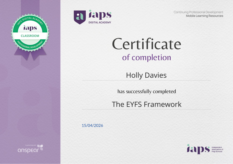 Awarded for completing the The EYFS Framework CPD course from the IAPS Digital Academy.