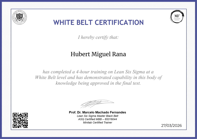 Unlocking the foundational principles of Lean Six Sigma, the White Belt certification offered by MF OPEX, led by Professor Marcelo Fernandes, stands as a beacon of excellence in operational training. Through a comprehensive curriculum blending theory with practical application, participants gain invaluable insights into waste reduction, variation management, and continuous improvement. Professor Fernandes' expertise infuses the program with industry-leading practices, equipping learners with the knowledge and skills to drive tangible improvements within their organizations. Serving as a catalyst for professional growth, this certification paves the way for further advancement in the field of operational excellence, empowering individuals to become agents of positive change in their respective industries.