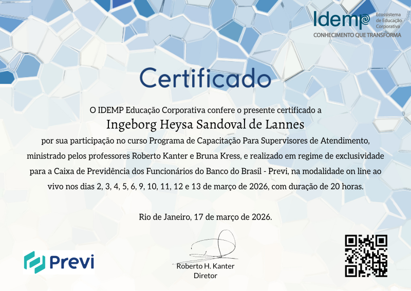 O papel de Supervisor de Atendimento representa um eixo crítico de qualidade, produtividade e alinhamento cultural. Supervisores conectam estratégia e operação: cuidam da experiência do cliente, orientam a equipe, monitoram indicadores e garantem que o atendimento reflita os valores e diretrizes organizacionais. Esta trilha foi estruturada para preparar profissionais que desejam evoluir para uma atuação madura, técnica e humana, dominando tanto a lógica dos processos quanto a habilidade de orientar pessoas. Cada módulo combina fundamentos, ferramentas e prática intensiva, reforçando a aplicação imediata no cotidiano da Previ.