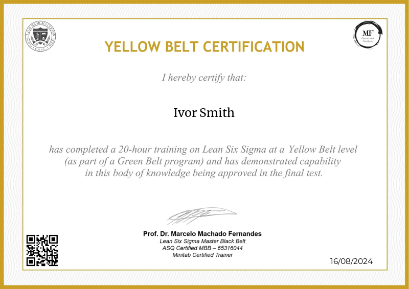 Delving into the intermediate principles of Lean Six Sigma, the Yellow Belt certification provided by MF OPEX, guided by Professor Marcelo Fernandes, marks a significant progression in operational excellence training. Through a meticulously structured curriculum blending advanced theories with practical application, participants deepen their understanding of process optimization, advanced data analysis, and project leadership. Professor Fernandes' renowned expertise enriches the program with cutting-edge methodologies, empowering learners to spearhead impactful improvements within their organizations. Serving as a pivotal milestone in professional development, this certification not only opens doors to larger-scale projects but also fosters the confidence and skills needed to drive transformative change across diverse industry landscapes.
