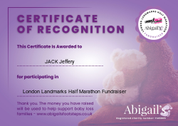 This certificate and badge is awarded in recognition of taking part in the London Landmarks Half Marathon, as part of Abigail’s Footsteps’ largest fundraising event of the year.