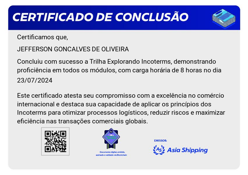 A Trilha Explorando Incoterms inclui elementos relacionados ao comércio internacional, como ícones representando diferentes termos de Incoterms, símbolos de negócios globais ou elementos que destacam a importância do entendimento dos Incoterms para profissionais envolvidos em transações comerciais internacionais. Essa badge serve como um símbolo de conquista e conhecimento na área de comércio internacional e logística.