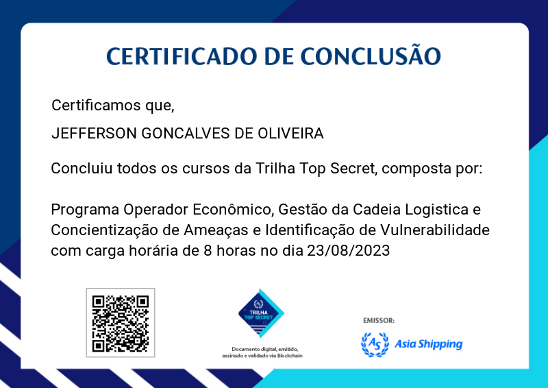 A Trilha Top Secret é mais uma badge do programa de certificação da Asia Shipping. Nela você terá a oportunidade de conhecer fatos importantes sobre toda nossa Gestão da Cadeia Logística, além de informações mais aprofundadas sobre conscientização de Ameaça e Identificação de vulnerabilidades e o Programa de Operador Econômico Autorizado, aplicados em nossa companhia.