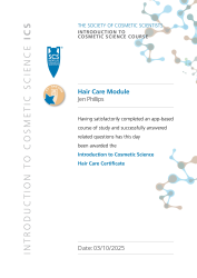 Completed the Hair Care module on the Society of Cosmetic Scientists (SCS) Introduction to Cosmetic Science (ICS) course and passed the module test.