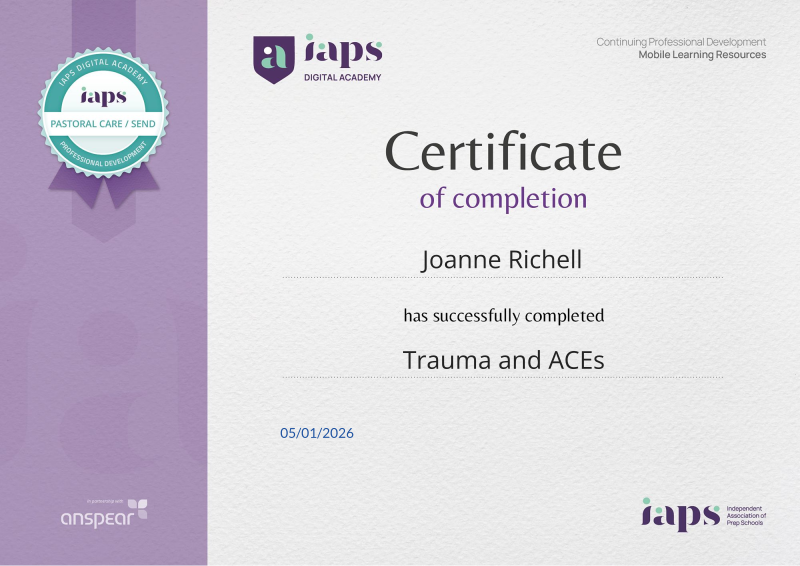 Awarded for completing the Trauma and ACEs CPD course from the IAPS Digital Academy.