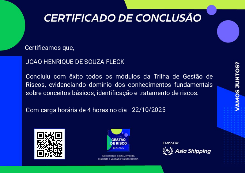Esta badge certifica a conclusão da Trilha de Gestão de Riscos. O participante demonstrou domínio dos conhecimentos essenciais sobre a conceitos básicos, identificação e tratamento de riscos.