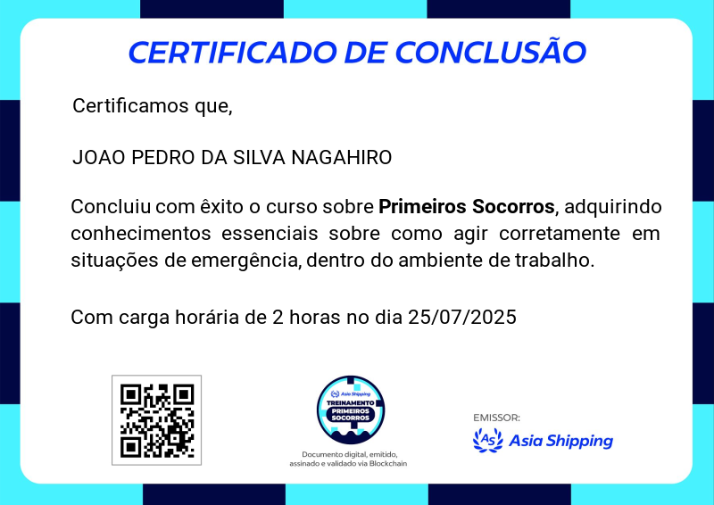 Esta badge digital certifica a conclusão do Treinamento de Primeiros Socorros da Asia Shipping, demonstrando um compromisso proativo com a segurança e a saúde de todos no ambiente de trabalho.