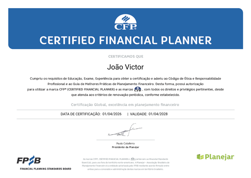 Símbolo de excelência em planejamento financeiro, o selo CFP® - Certified Financial Planner é a mais respeitada certificação internacional de distinção, garantido ao profissional certificado o reconhecimento de suas habilidades e competências na atividade de planejador financeiro pessoal e familiar por parte de seus clientes, parceiros e do mercado.